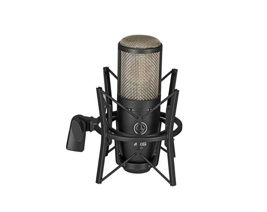 For a variety of miking applications including lead vocals, acoustic guitar, and brass instruments, the black Project Studio P220 Large Diaphragm Condenser Microphone from AKG features a 1" true condenser capsule with a cardioid polar pattern. A low-cut filter at 300 Hz allows you to cut unwanted low end from your sources, while its selectable -20 dB pad allows the mic to handle SPLs up to 155 dB, allowing it to be placed in front of a variety of sources. A spider shockmount and aluminum carry case are included.